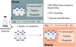 - Bailey, C. A.,* Gwyther, P., Čaušević, S., Greene, B. L., and van der Meer, J. R. “Phosphite as an engineered niche for Pseudomonas veronii in a synthetic soil bacterial community.” mSystems 2025, e00061-25.